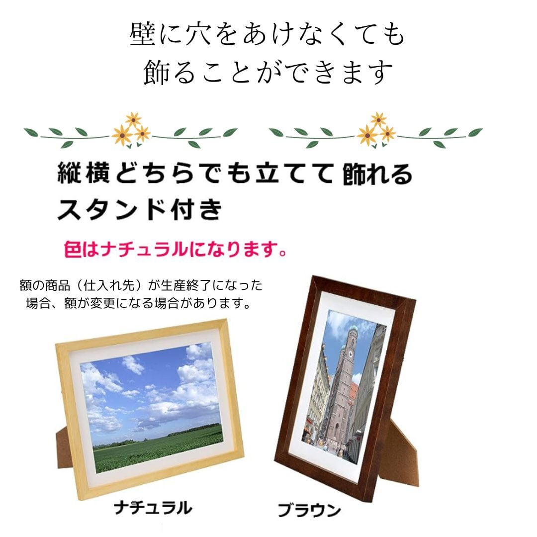 1枚目の写真の額が茶色ですが、実際にお届けするのは、2枚目以降のお写真どおり、白の額になります。